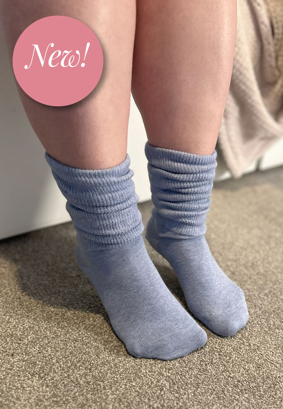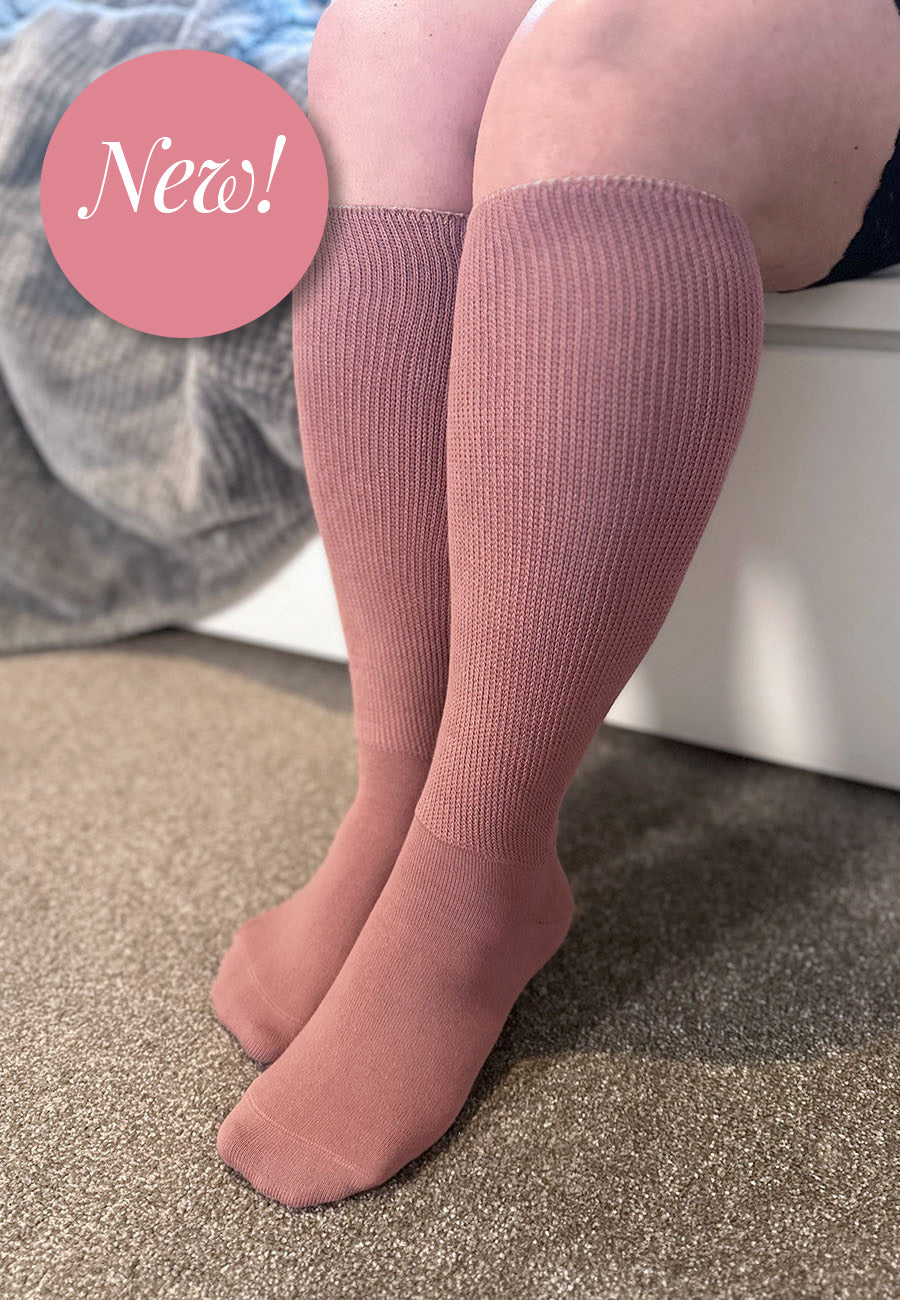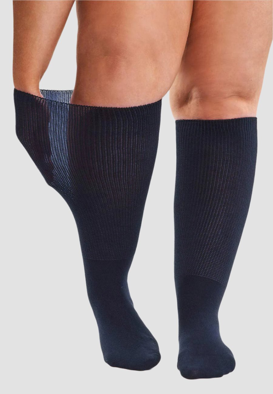 Extra wide from calf to toe, with a non-binding cuff. No more socks that leave marks on your legs!