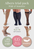 For wide, swollen or sensitive lower legs and ankles, this discounted trial pack offers the chance to see which of our Albers products is most suitable for your needs. All are Wide, and the Sensitive styles have a new, even more gentle cuff - designed with sensitive skin in mind. This pack contains 8 pairs of knee highs and anklets in total.