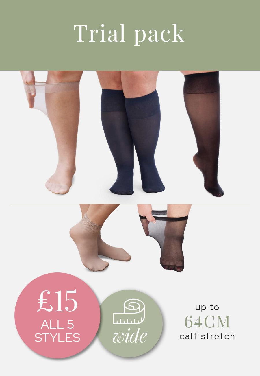 For wide or swollen lower legs and ankles, this discounted trial pack offers the chance to try out 5 Wide styles to see which is most suitable for your needs.